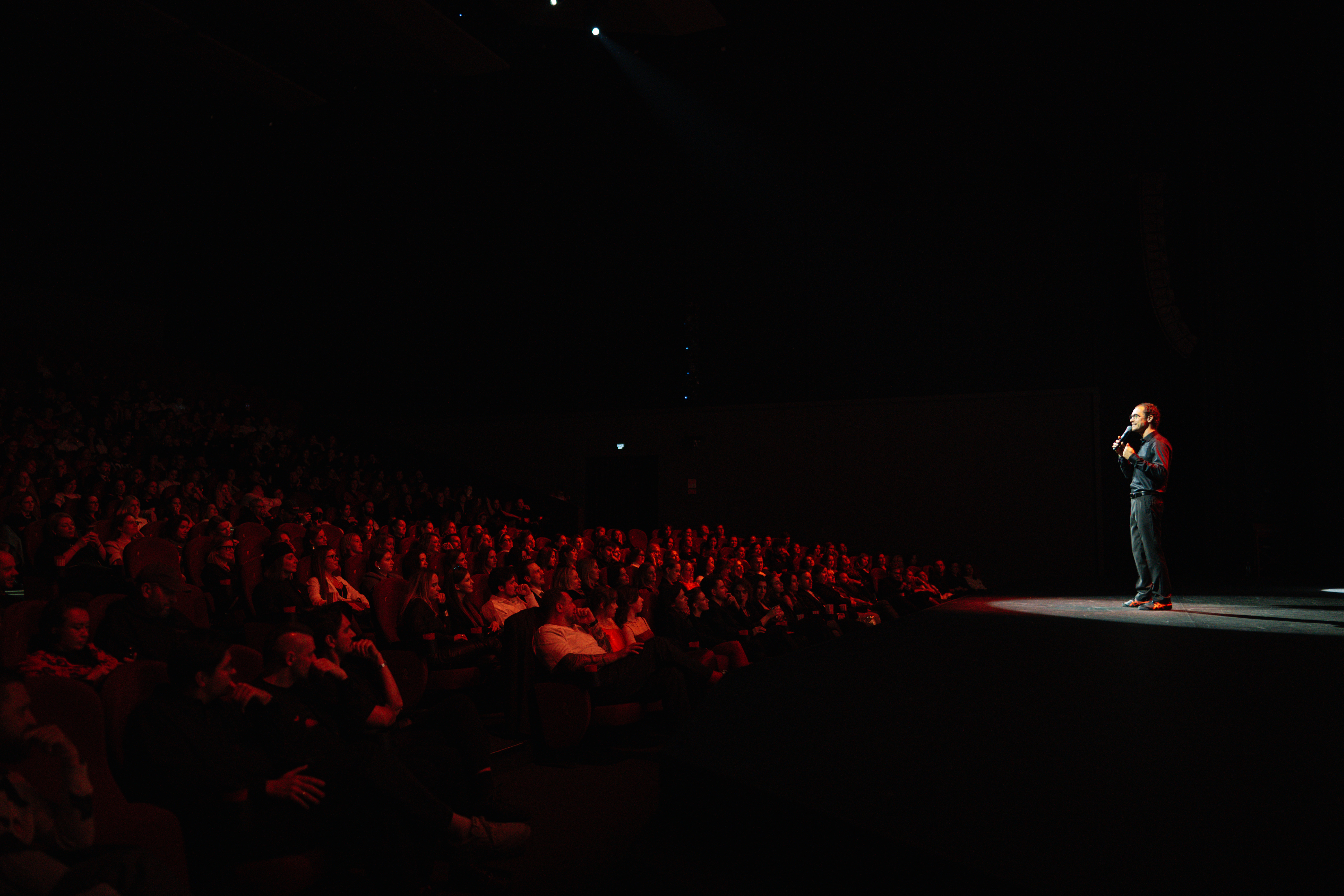 Выбор «Мосфильма» с его красным визуальным кодом оказался логичным продолжением этой идеи. Плюс киноязык был близок ивенту: сценарий, визуальная драматургия, работа с ритмом и вниманием. Так, наша команда, которая сама годами создает «фильмы в один дубль» для клиентов, оказалась в роли главного героя собственного показа на большом экране.