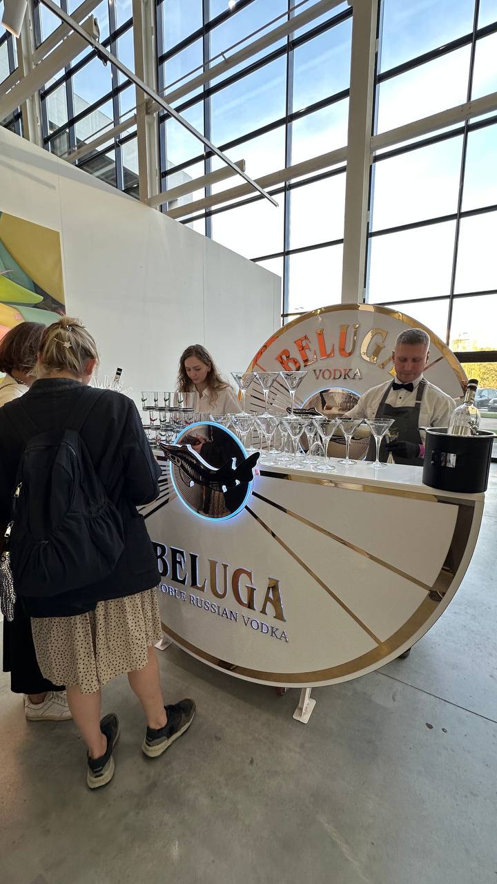 Два бара удобно расположились на разных этажах выставки, поэтому можно выбрать место по настроению и обсудить искусство за бокалом коктейля.
