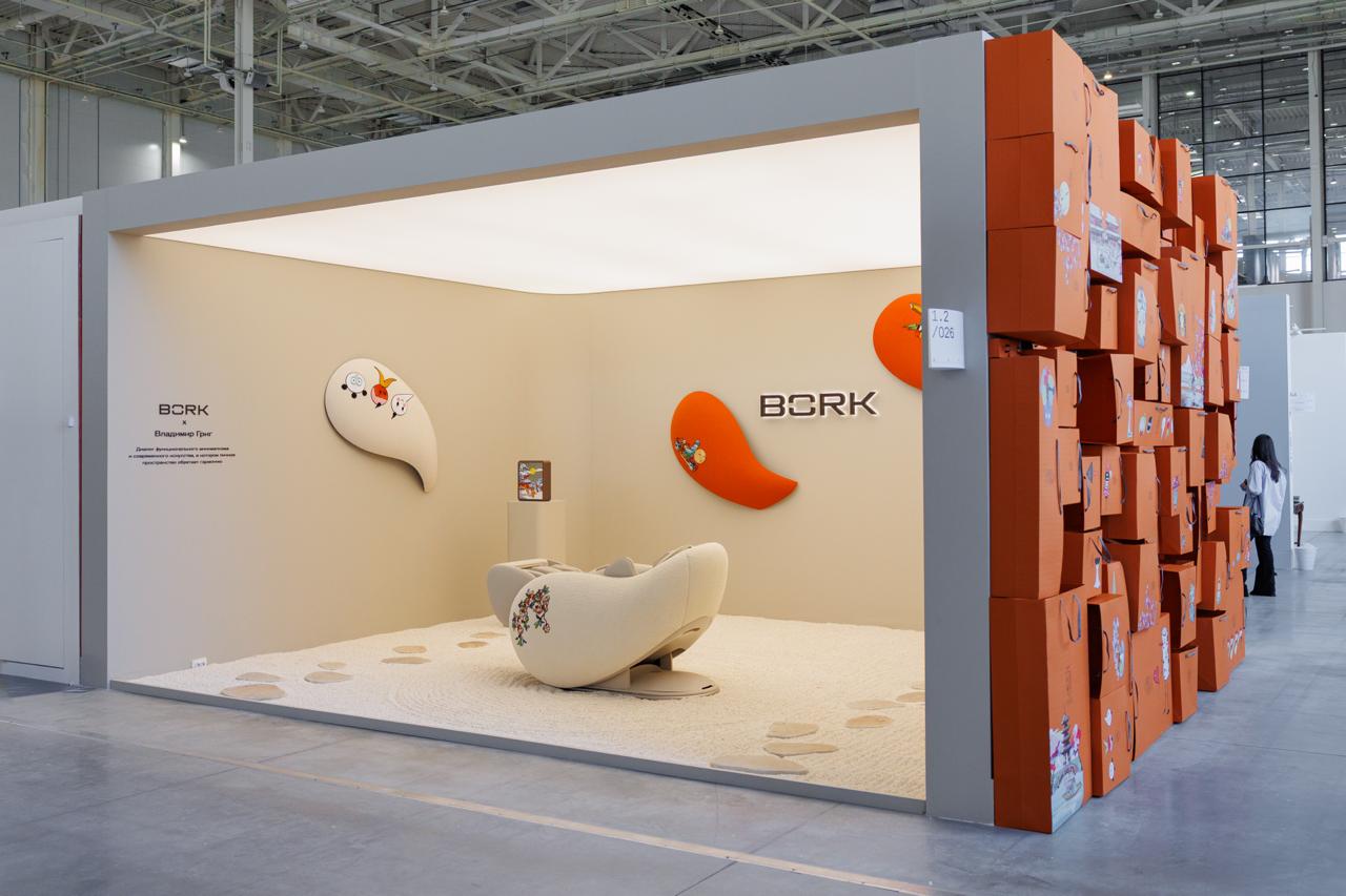 Минимализм дополнили вышитые работы Владимира Грига и фотозона из пакетов с авторскими рисунками. Как обычно у BORK — красиво, качественно, эстетично.