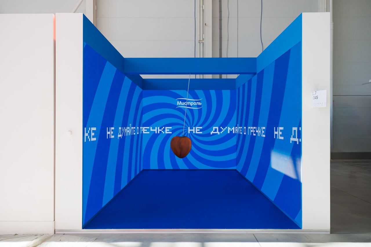 Как только мы пытаемся вытеснить мысль, она захватывает сознание с новой силой, заставляя разум метаться подобно маятнику, между приказом и его нарушением. Это самоцензура, приводящая к легкому трансу навязчивой идеи. Эта идея была заложена в стенд Мистраль, где на экранах транслировалась бегущая строка с одной единственной фразой «не думайте о гречке» на фоне гипнотизирующего маятника в виде той самой гречки.