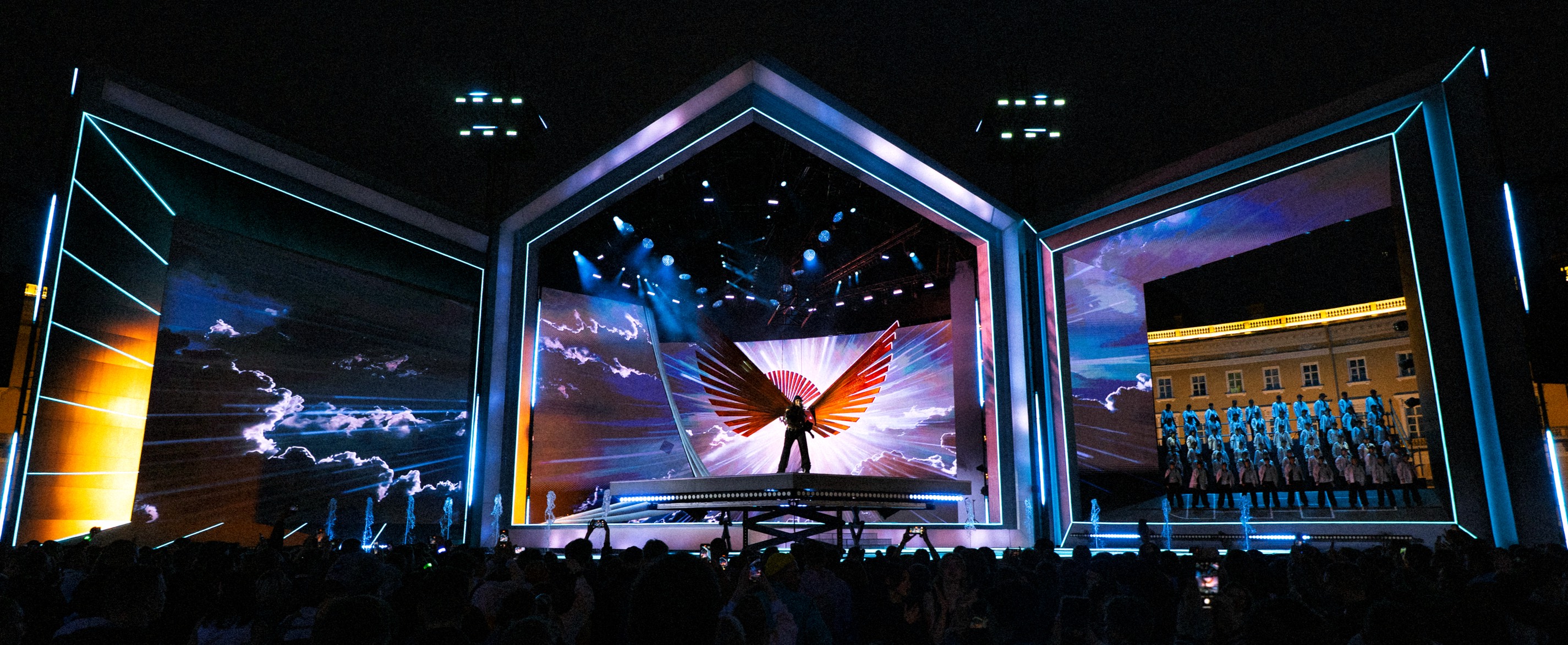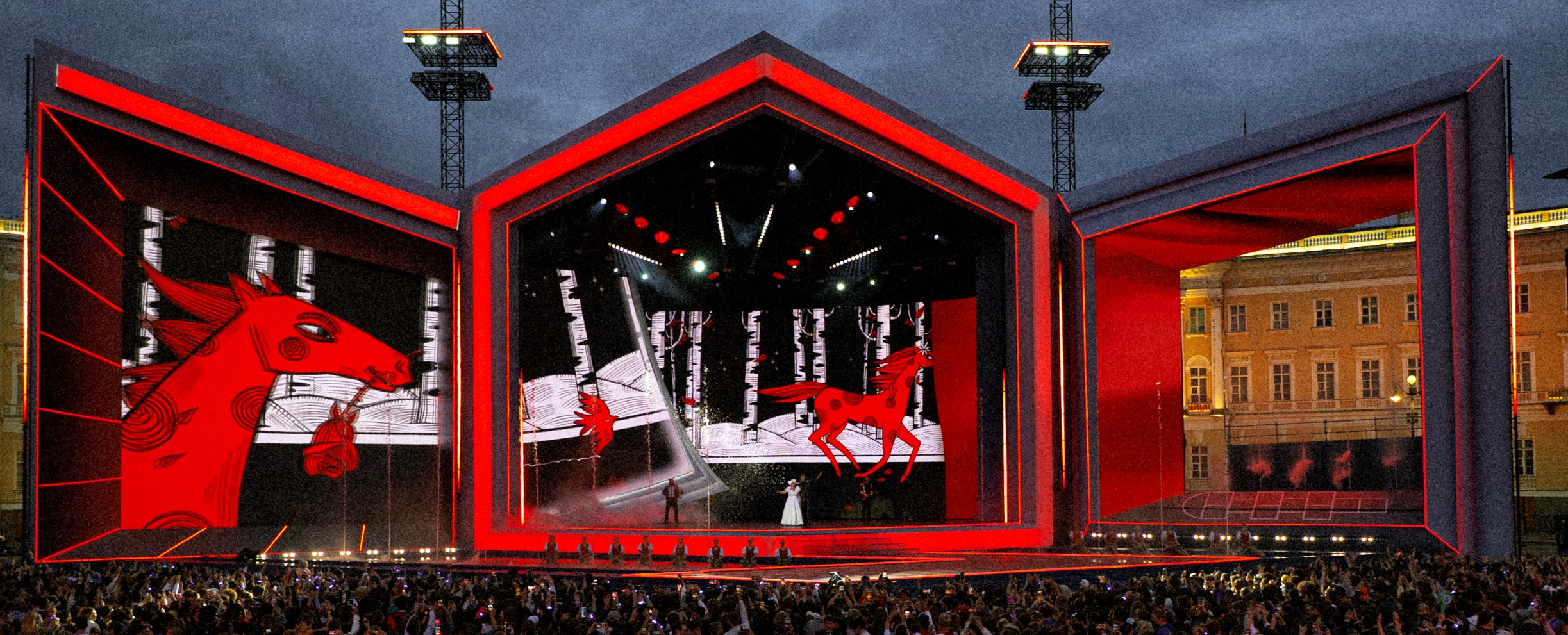 Иногда сцену нужно буквально встроить в город. В одном из блоков перед нами стояла нетривиальная задача: интегрировать цифровой контент в архитектурное пространство Дворцовой площади и создать эффект «прозрачных экранов». Другими словами было необходимо добиться эффекта, в котором бы контент бесшовно «продолжал» здание Генштаба. Для этого потребовалась точная адаптация модели под архитектуру и согласование с реальными формами фасада. Особенность заключалась в том, что экраны сцены были расположены под разными углами, и с учетом их изогнутой поверхности это стало для нас творческим и техническим вызовом.