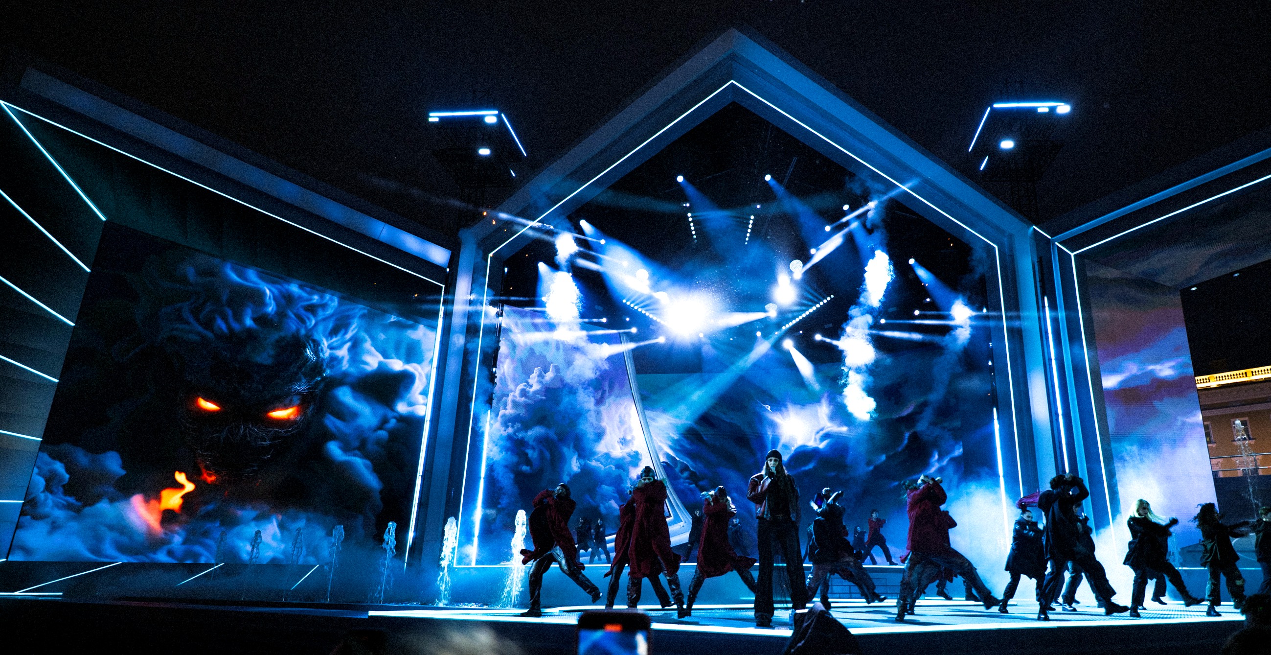 В номерах Bearwolf мы сознательно вышли за рамки привычного концертного формата, хотелось создать нечто большее — театральное представление. Мы выстроили действие как музыкальное попурри из трех частей, где каждая сцена раскрывала сюжет о противостоянии света и тьмы. Сначала оживала и сгущалась тьма, которая словно вырастала из глубины экранов в виде загадочных персонажей, олицетворяющих зло. Вода вокруг сцены помогала визуалу — фонтаны резко взмывали вверх, превращая пространство в тревожную стихию. В финале, когда мрак будто достигал пика, появлялась Жар-птица — физическая декорация, озаренная светом и графикой. Она стала символом перерождения и победы добра. Эту инсталляцию, как и остальные сценические декорации, создала команда Fabrica Art.