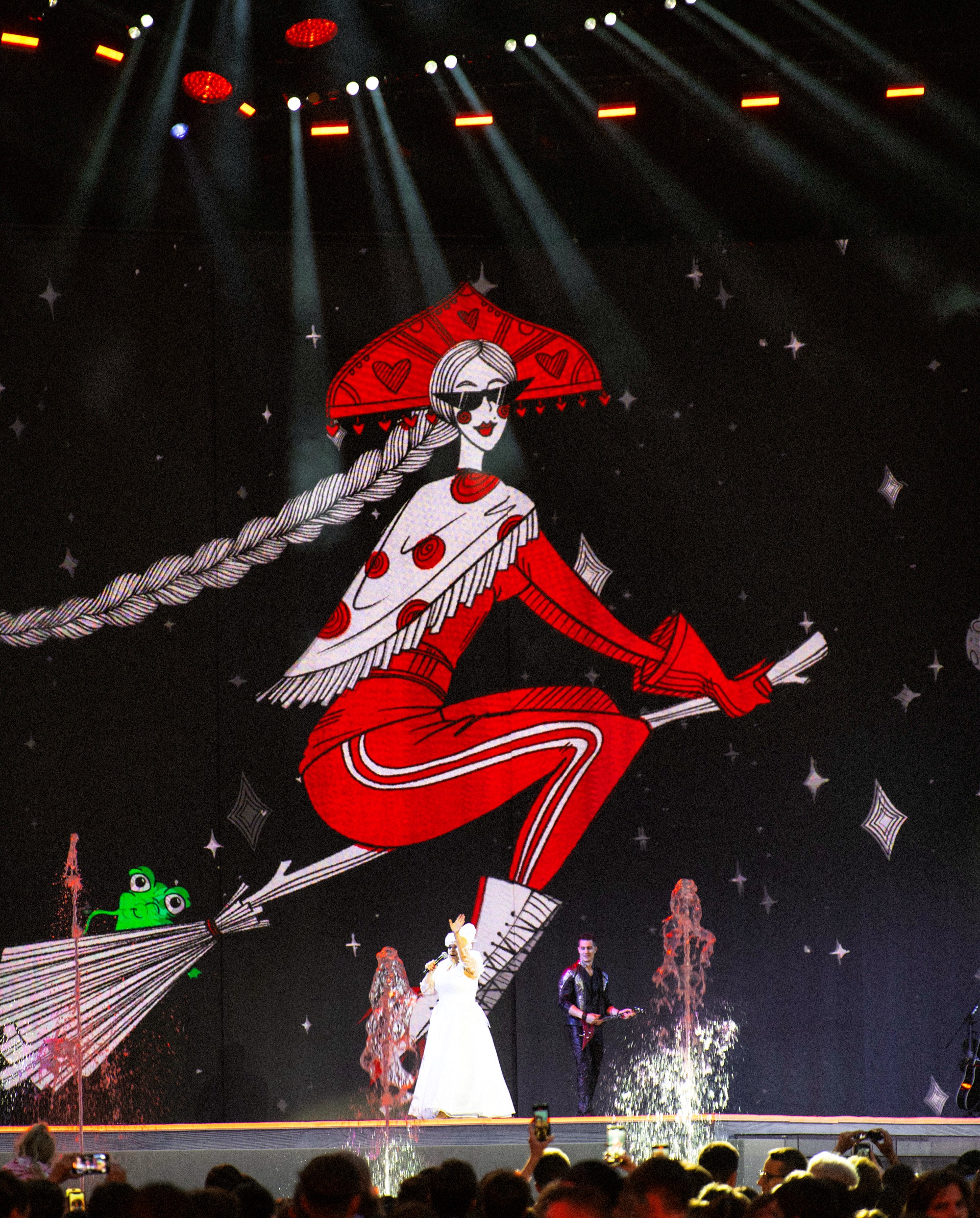 Техники традиционной анимации, отсылающие к эпохе советских мультфильмов, добавили концерту теплой аналоговой эстетики. Помимо ностальгии зритель увидел оригинальную интерпретацию: первый советский спутник, пролетающий над сценой совместно с ведьмами на метлах в космическом пространстве. Любимцами зрителей стали лягушки, восседающими на мухоморах — персонажи, превратившиеся в мемы соцсетей еще до окончания номера.