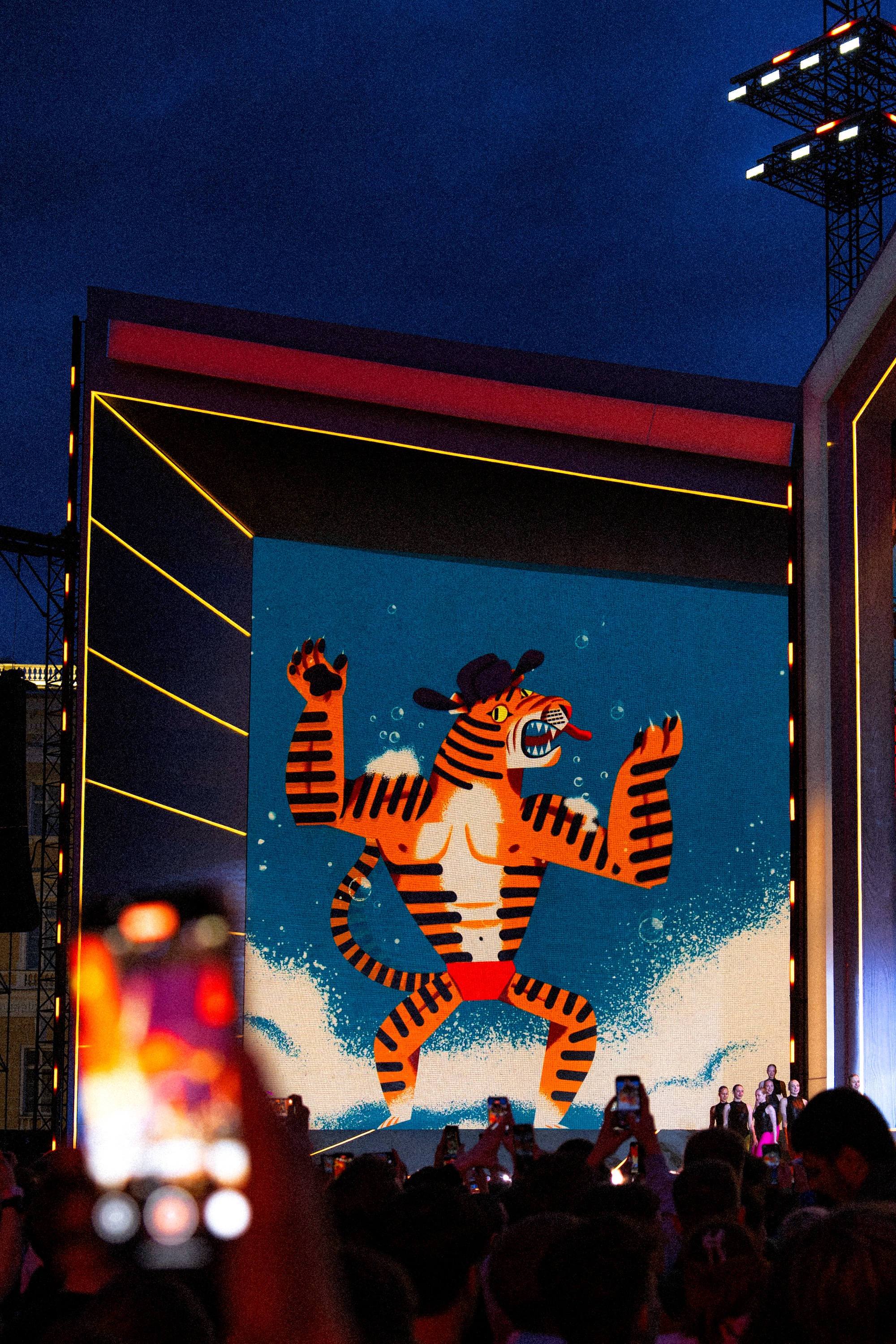Идея игривой анимации продолжилась и в физическом пространстве: в бассейне рядом со сценой выступали синхронистки в разноцветных колготках и туфлях. Их хореография рифмовалась с происходящим на экранах, добавляя шоу еще один уровень движения и цвета. Визуальный и сценический ритм сливались в цельную атмосферу праздника и фантазийности.