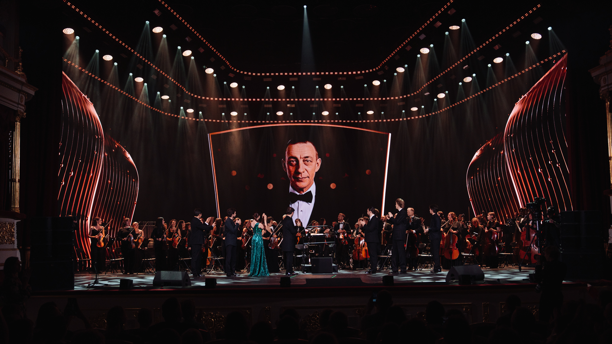 Для каждого номера был создан свой особый визуальный образ, вдохновленный великими музыкальными произведениями. Объемный 3D-контент, генеративная графика и ролики, сгенерированные с помощью ИИ, транслировались на масштабном экране позади сцены и прозрачной проекционной сетке, которая размещалась перед оркестром и создавала эффект голограммы.