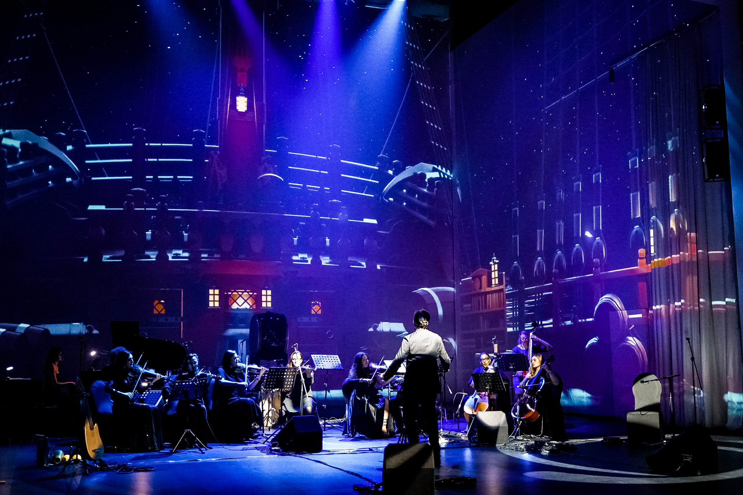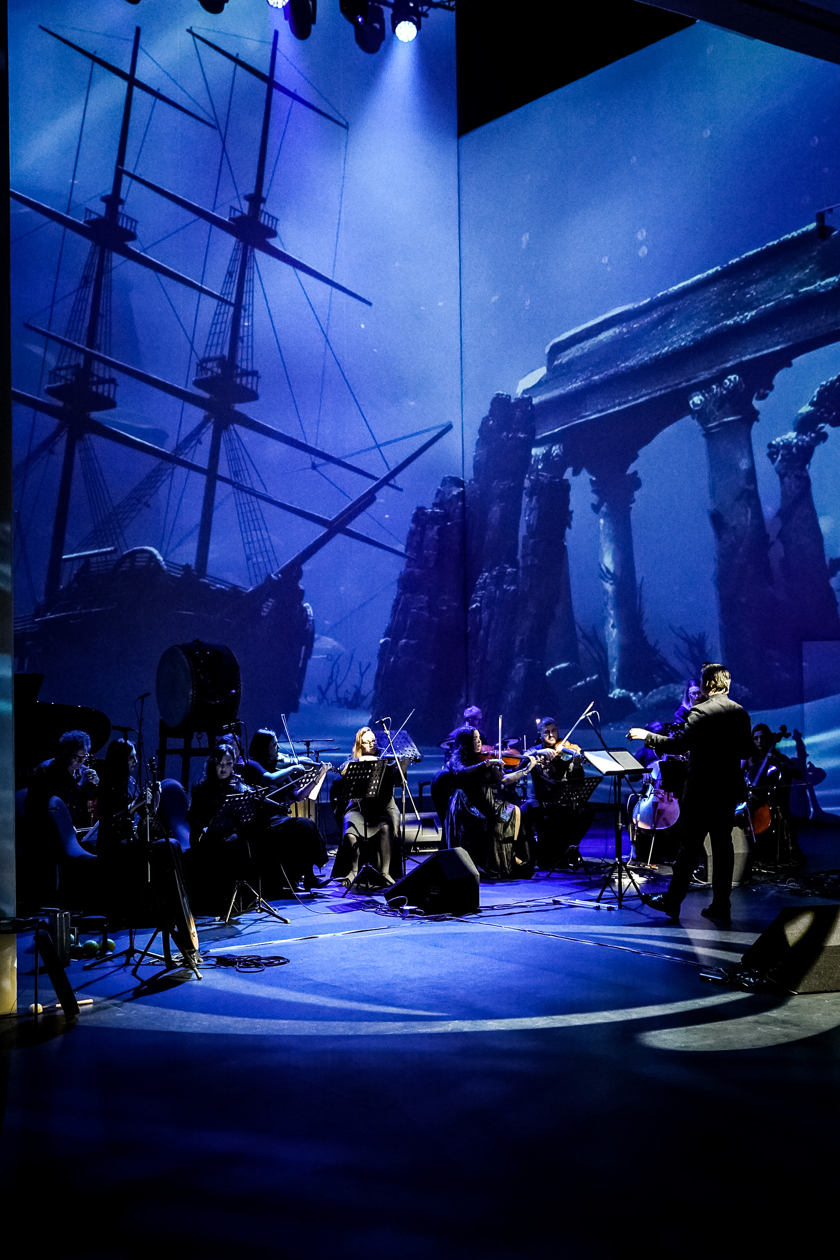 Пространство включало более 1500 квадратных метров проекции — стены, потолок и выступающие конструкции. Каждый из этих элементов требовал отдельного подхода к мэппингу и художественному решению. Архитектура зала превратилась в инструмент нарратива: на выступах «вырастали» цифровые колонны, потолок становился поверхностью воды, сквозь которую зрители видели проплывающих рыб, а стены стали корпусом корабля. Пространство реагировало на музыку, а визуальный ряд развивался параллельно с драматургией, где весь мультимедиаконтент синхронизировался с живым оркестром.