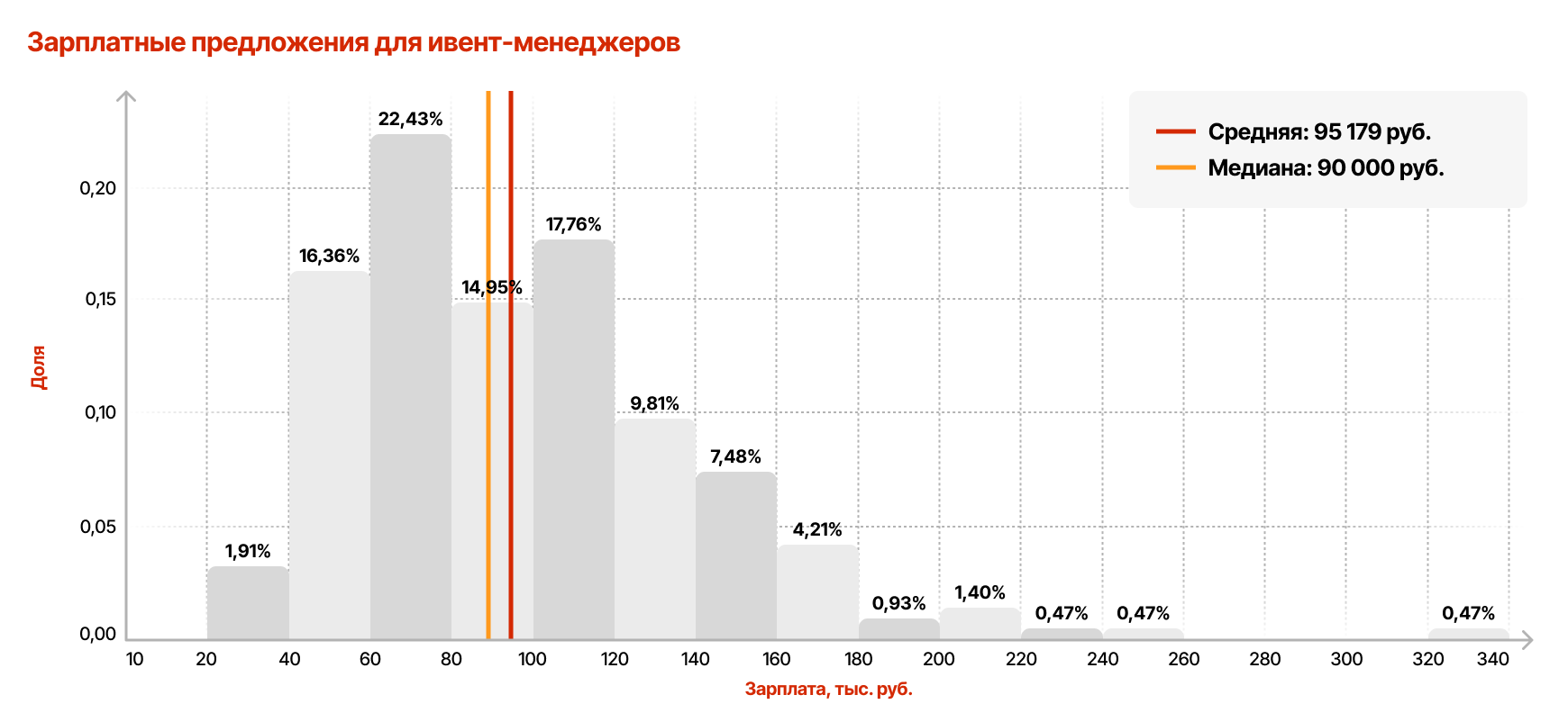 В среднем работодатели предлагают ивент-менеджерам 95 тыс. рублей «на руки». Медиана зарплат находится на уровне 90 тыс., а вилка варьируется от 63 до 119 тыс. рублей. Таким образом, рынок не демонстрирует перекосов по зарплатам.