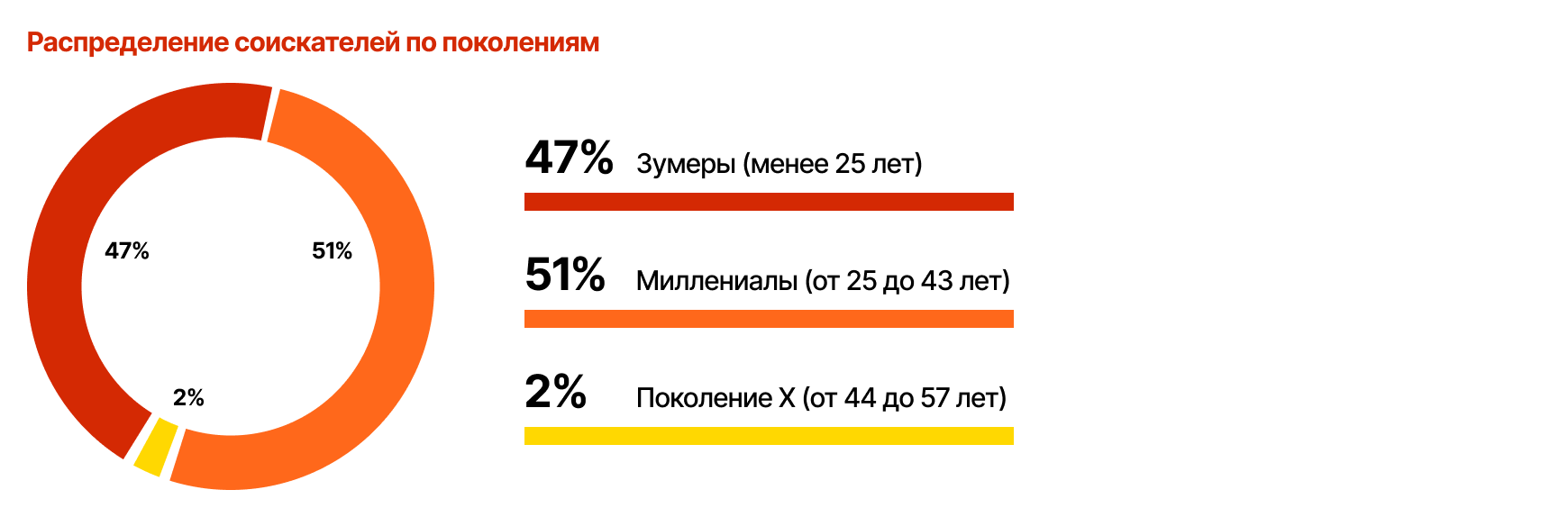 Если смотреть по поколенческо-возрастному критерию, то ядро рынка составляют миллениалы (51%) в возрасте от 25 до 43 лет. На втором месте — зумеры, то есть молодые специалисты до 25 лет, их 47%. Всего людей от 20 до 30 лет — 62%, они и формируют основной класс ивент-специалистов, при этом средний возраст кандидата — 27 лет. Представителей поколения Х всего 2%, так как многие «старшие» кандидаты переходят в смежные сферы или занимают управленческие позиции.