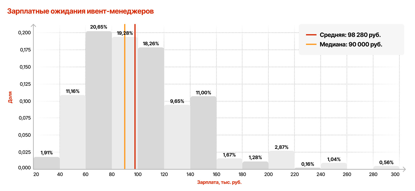 Средние зарплатные ожидания ивент-специалистов находятся на уровне 98 тыс. рублей, медиана — 90 тыс. рублей. Зарплатная вилка варьируется от 70 до 120 тыс., что почти совпадает с предложениями работодателей — рынок относительно сбалансирован. Есть и крайние случаи. Максимальные запросы доходят до 300 тыс. рублей, их заявляют единичные московские специалисты с 20-летним опытом. Минимальные ожидания — около 20 тыс. рублей — характерны для студентов без опыта либо с небольшим опытом в студенческих организациях и домах культуры.