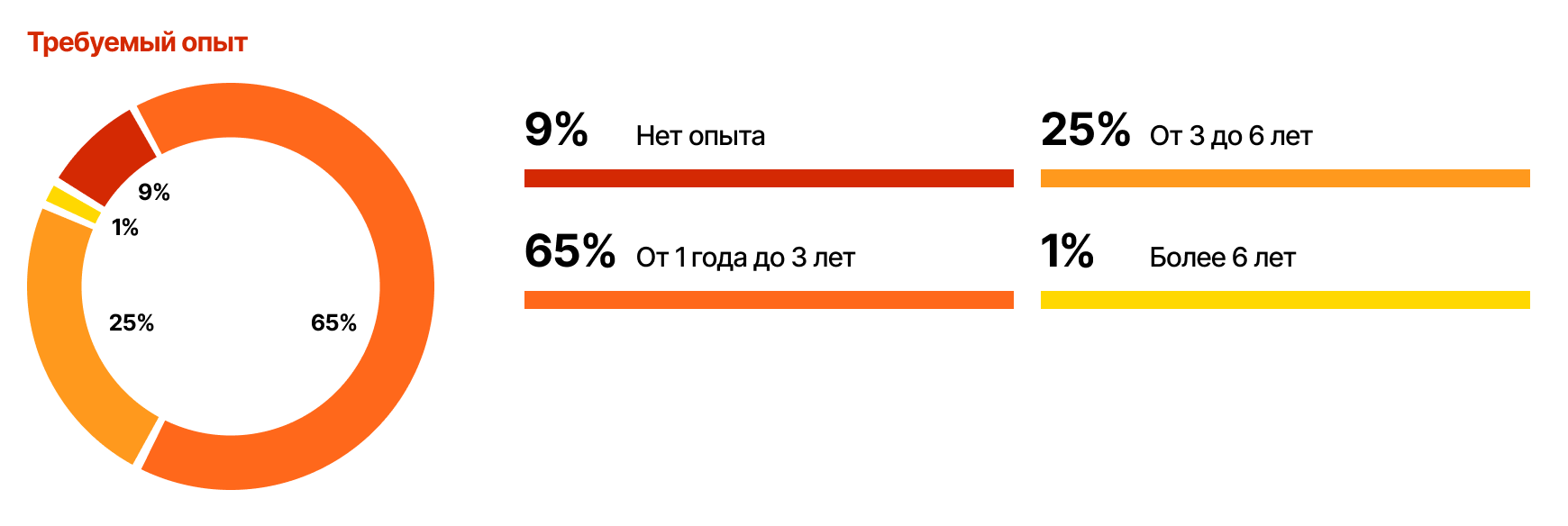 Работодатели довольно гибко относятся к образованию: высшее требуется лишь в 21% вакансий. Главный критерий — опыт работы. Наиболее востребованы специалисты с опытом от одного года до трех лет: на них приходится 65% всех предложений.