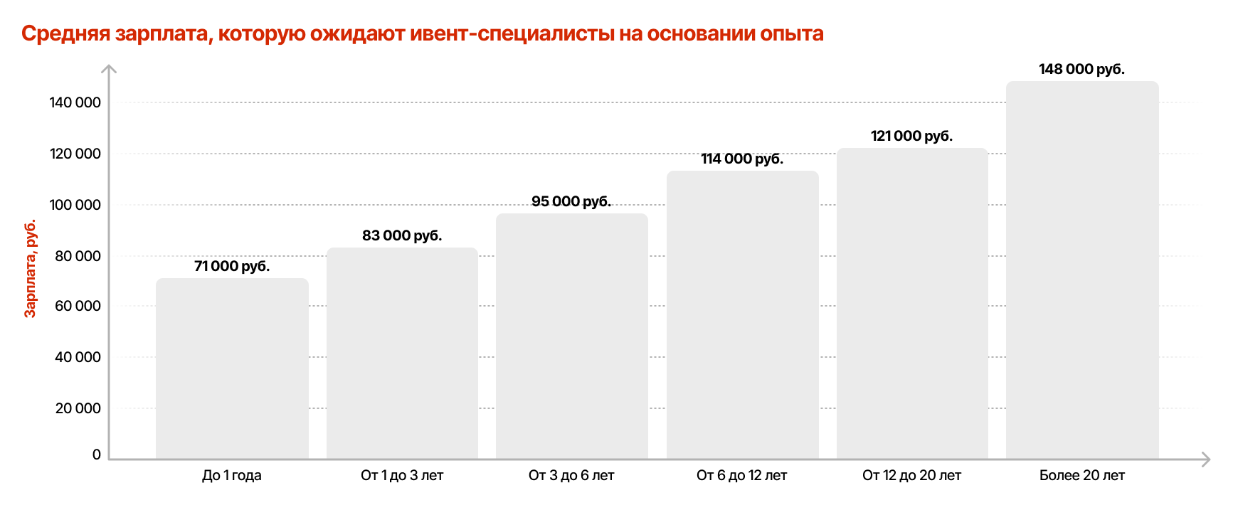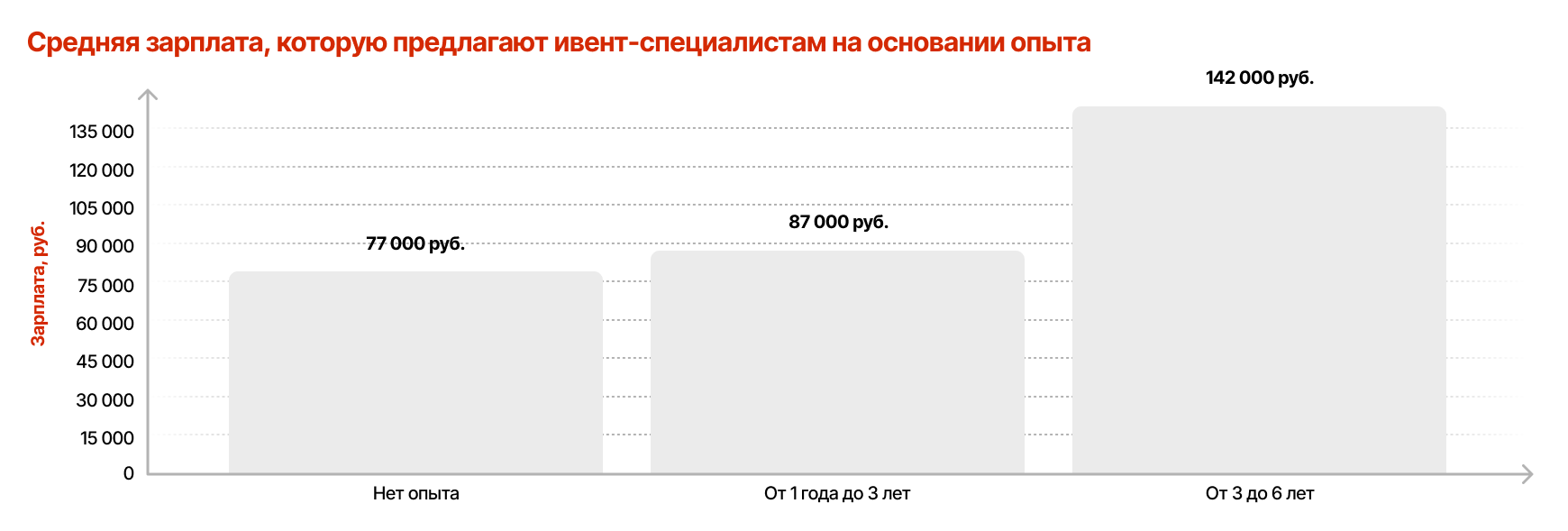 После этого карьерного рубежа динамика практически исчезает: для специалистов с опытом более шести лет вакансий крайне мало, а предлагаемые условия часто не раскрываются. Вероятно, на этом уровне кандидаты получают предложения по личным рекомендациям или уходят в руководящие позиции. Таким образом, рынок формирует видимый «потолок»: статистика фиксирует остановку роста доходов, хотя в реальности заработки опытных ивент-менеджеров могут быть выше, но они остаются вне публичных данных.