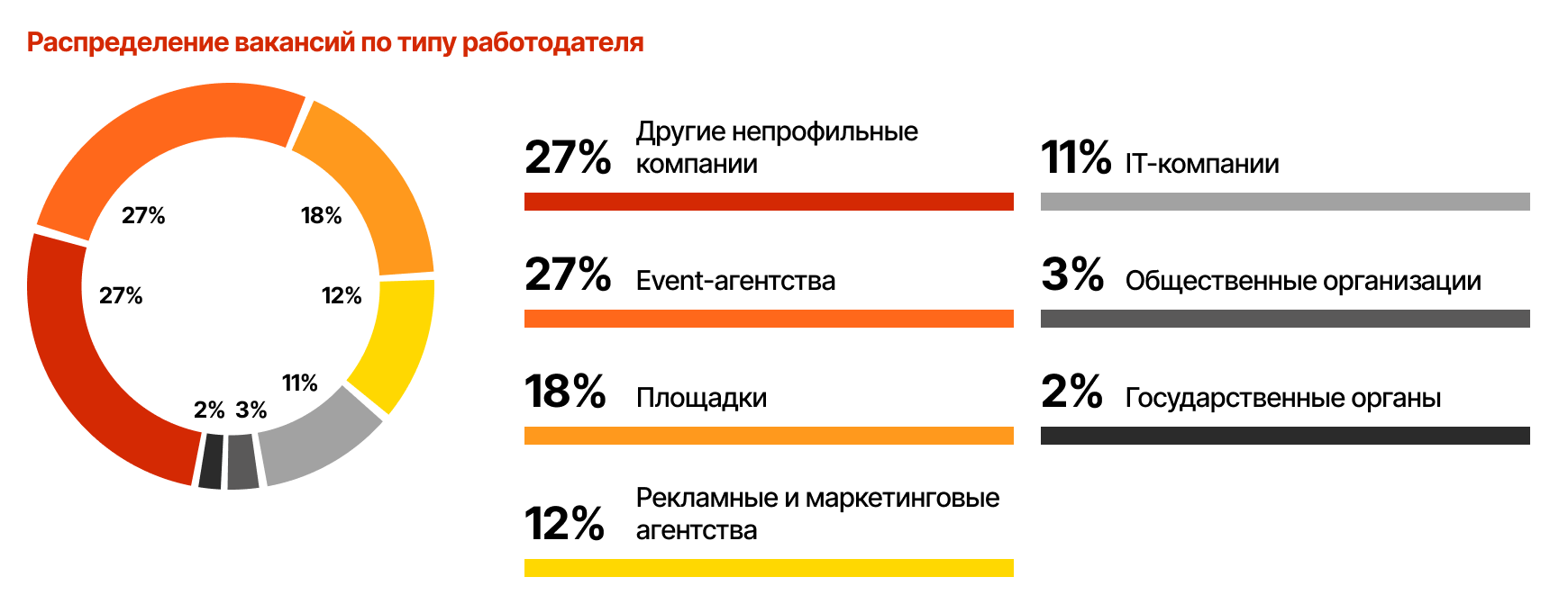 Компании, публикующие вакансии, можно разделить на несколько групп. Лидируют работодатели, для которых ивенты не являются основной деятельностью, причем каждое десятое предложение размещают IT-компании, далее идут вакансии от профильных ивент-агентств (27%), площадок (18%) и рекламных агентств (12%).