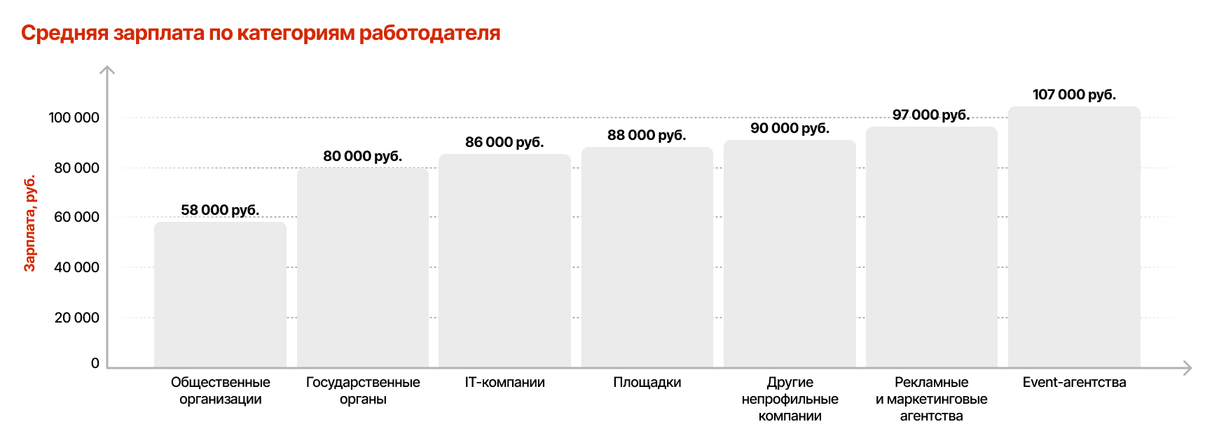 По уровню дохода картина иная. Самые высокие зарплаты предлагают ивент-агентства — в среднем 107 тыс. рублей, на втором месте находятся рекламные агентства (97 тыс.) Получается, что больше всего вакансий публикуют в основном компании «не из отрасли», но специализированные агентства задают верхний уровень оплаты.
