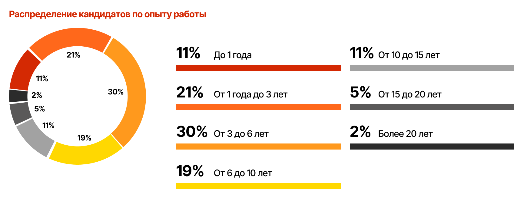 Большинство специалистов в ивент-сфере имеют высшее образование (72%), среди них встречаются даже кандидаты наук. Однако для работодателей диплом играет второстепенную роль, решающим является опыт. Среди резюме перекос в сторону опытных кандидатов: 38% соискателей имеют стаж более шести лет, а средний опыт специалистов на рынке — ровно шесть лет. При этом доля вакансий, где требуется такой уровень, минимальна — всего 1%. Напротив, рынок больше всего нуждается в специалистах с опытом 1—3 года (65% вакансий), но таких кандидатов только 21%.