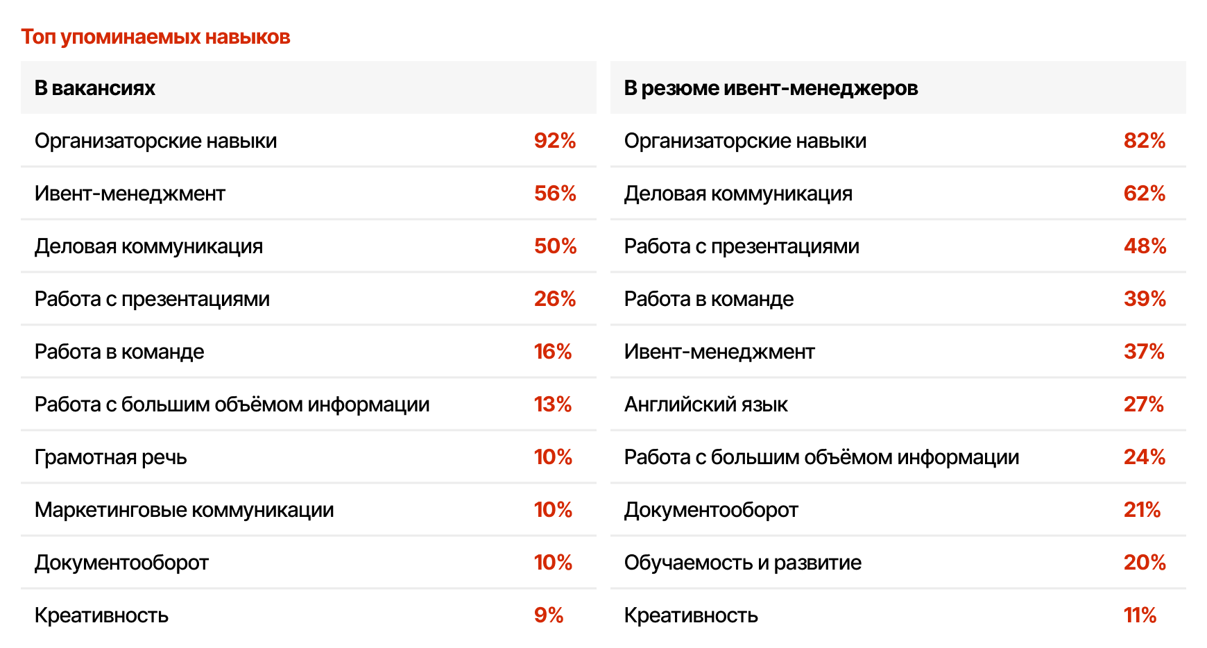 Анализ компетенций показал, что работодатели чаще всего ищут сотрудников с базовым опытом для ивента: обозначают навыки организации мероприятий (в том числе корпоративных и выездных), навыки управления проектами, а также деловой коммуникации: умение вести переговоры и переписку. Креативность же упоминается редко — всего 9%, у работодателей в приоритете надежность и системность.